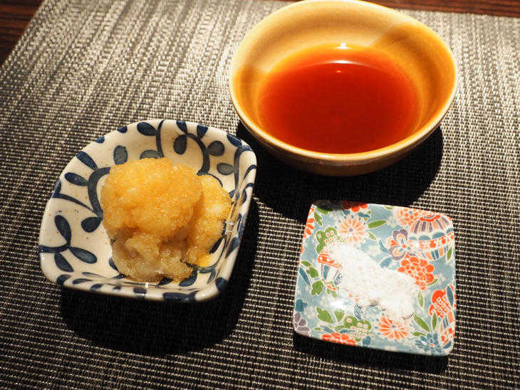 "そばがき"には、お好みで、そばつゆ・染め卸し・塩をつけていただきます。
