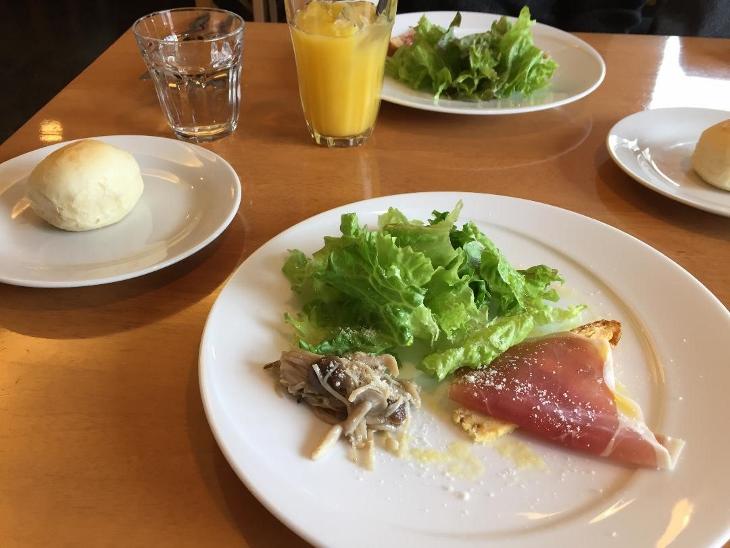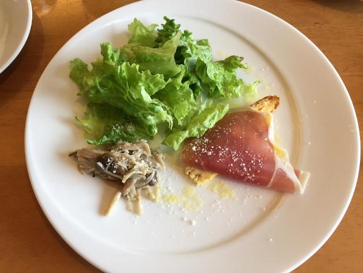 サラダ、キノコのマリネ、生ハム、イタリア風オムレツ(?)が生ハムの下に隠れています。ワインが欲しくなる~~(笑)。