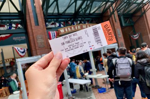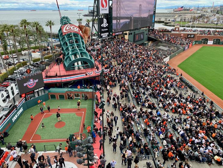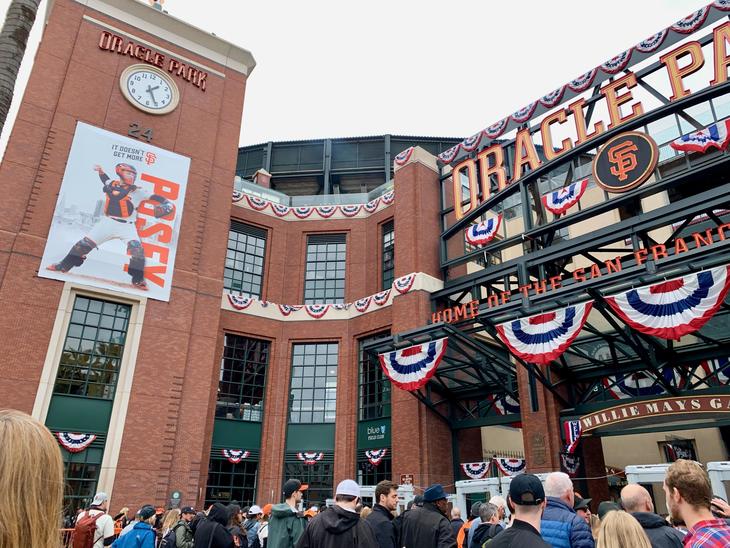 今シーズンから『オラクルパーク(ORACLE PARK)』 と名前が変わり5日ホームでの開幕戦。 午前中の雨もどうにか上がり、ニュースでは「屋根付きじゃないシートに人は椅子拭いてから座ってください」と言っていたが、立ち見席で59ドルなんで椅子ある人はいくら払ってるんだろ?
