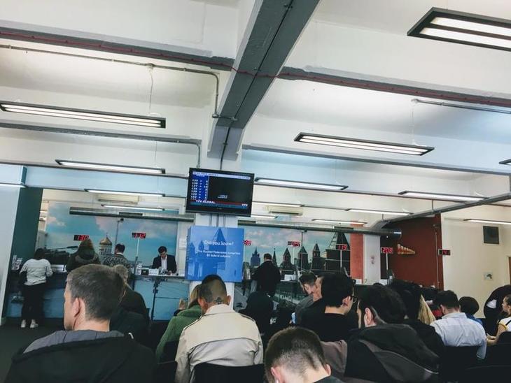 セキュリティチェックを受けて中に入ると、銀行受付によく似たカウンターがズラリと並んでいます。自分の札番号がテレビ画面に現れたら、窓口に進みます。これは長丁場になりそうだ、と思いましたが予想外に進みは早く、すぐに順番が回ってきました。