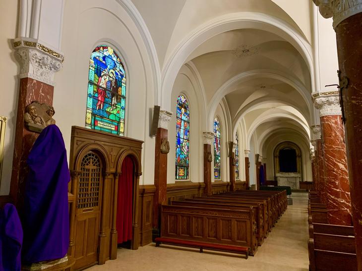 通路の右手のステンドグラスは手が届きそうなほど近い。 そして埃一つない。