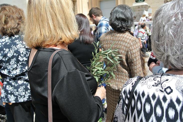 <枝の主日にロバに乗ったキリスト像のプロセシオンを見るのに、椰子やオリーブを持参する人も>
