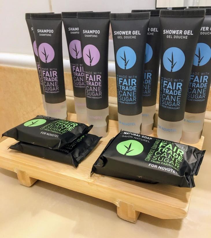 バスグッズはフェアトレードでサトウキビというブランド名からして、いかにもナチュラルでお洒落なパッケージ。欧州では五つ星でも「オン リクエスト」のバスローブは勿論常設ならず。リクエストするも、ここ最近「出払っていてもう在庫がない」という、理由まで他のホテルと同じで入手できず連敗中。ドリンク用の器が紙コップ、バスルームのグラスがプラスチック製だったのも初めての経験で驚きましたが、確かに洗う手間もなく清潔で便利ですね。