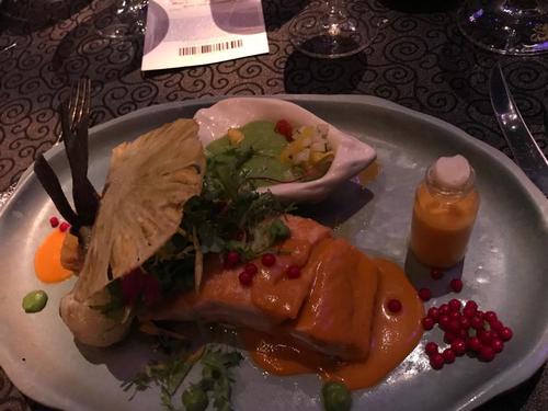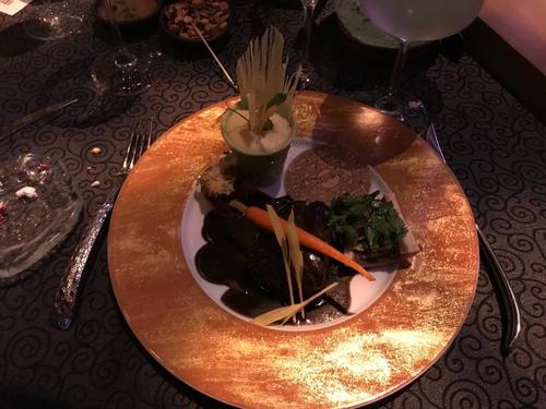 前菜は魚介類のマリネ、羊のチーズフルーツ添え、エビのタコ。