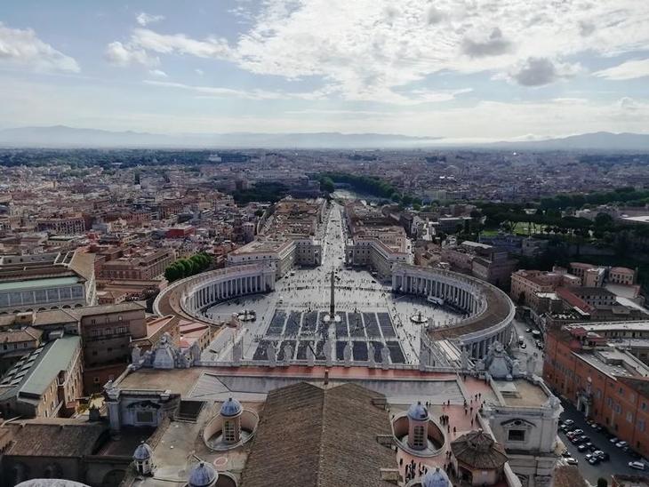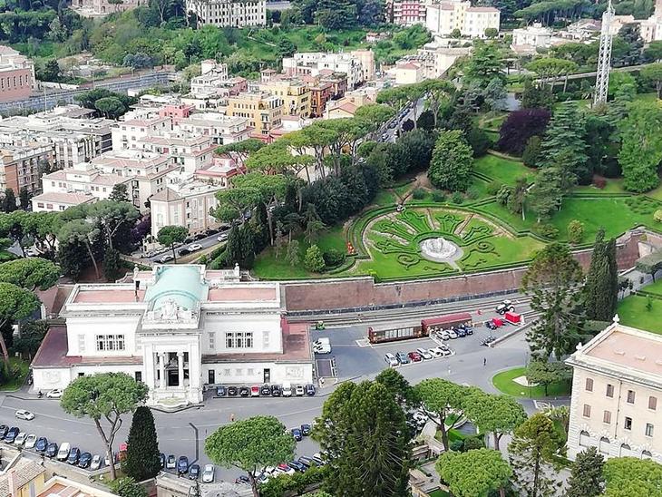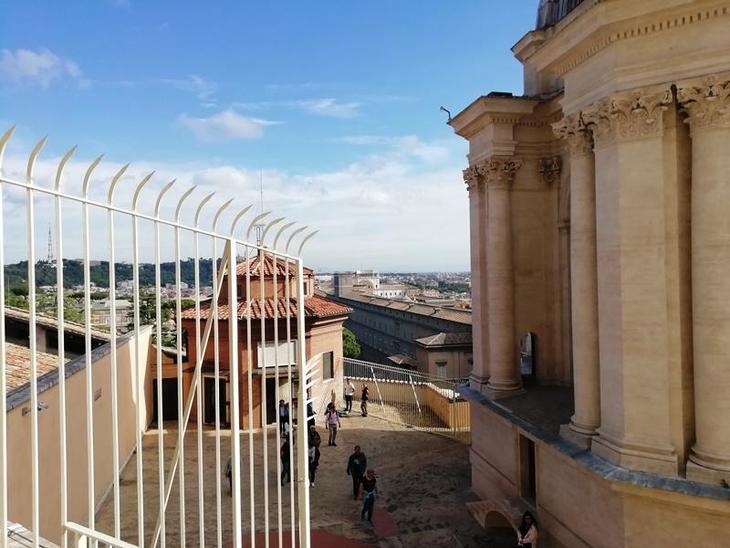 このクーポラの展望台は、1周できるようになっていますので、360度のローマの景色を眺めることができます。そこでは、ローマ教皇の紋章を象った印象的な花壇を前にしたヴァチカン政庁舎を見ることができます。