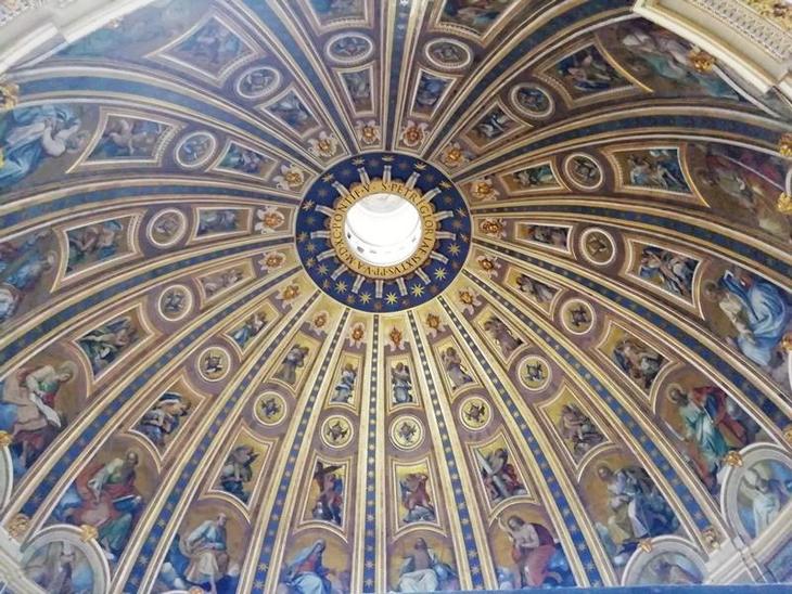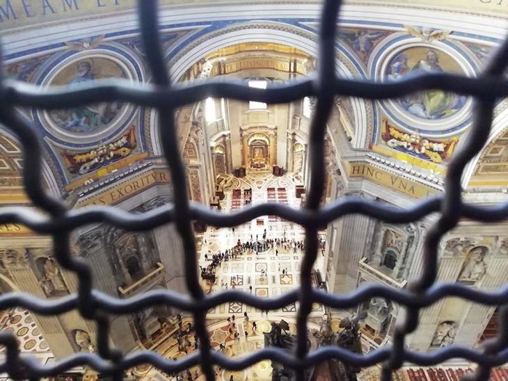 エレベーター利用や階段でテラスのような場所に辿り着くと、間近で壮大なクーポラを見ることができます。さらにそこからクーポラ内部に入るとサン・ピエトロ大聖堂の主祭壇を見下ろすことができ、改めてその明媚さに感動し、その大理石の床の美しさもまた感じることができます。