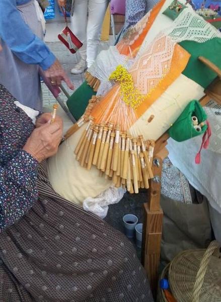 イビサの民芸品の実演販売もあります。下の写真はボリージョとい方法で作っているレース編みです。ボリージョで作る扇子はとてもエレガントなので必見です。