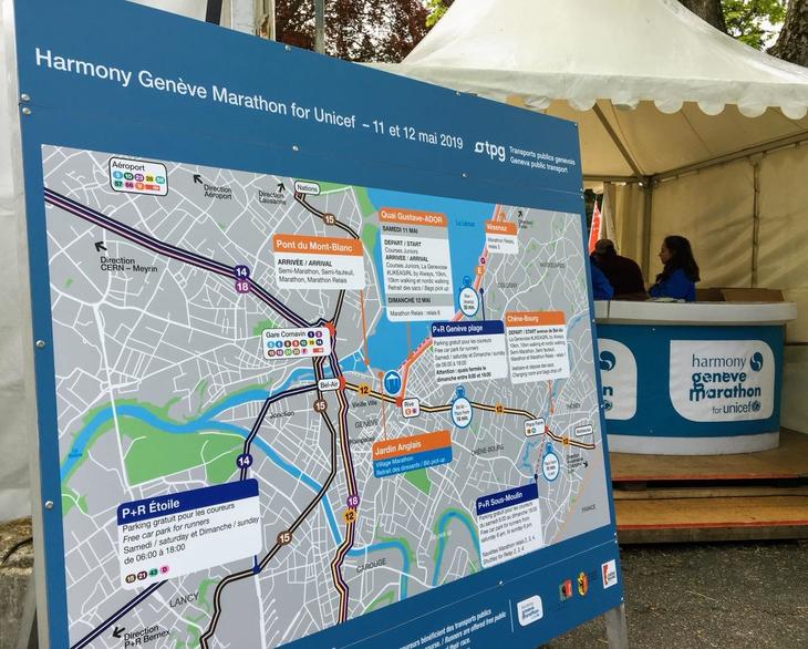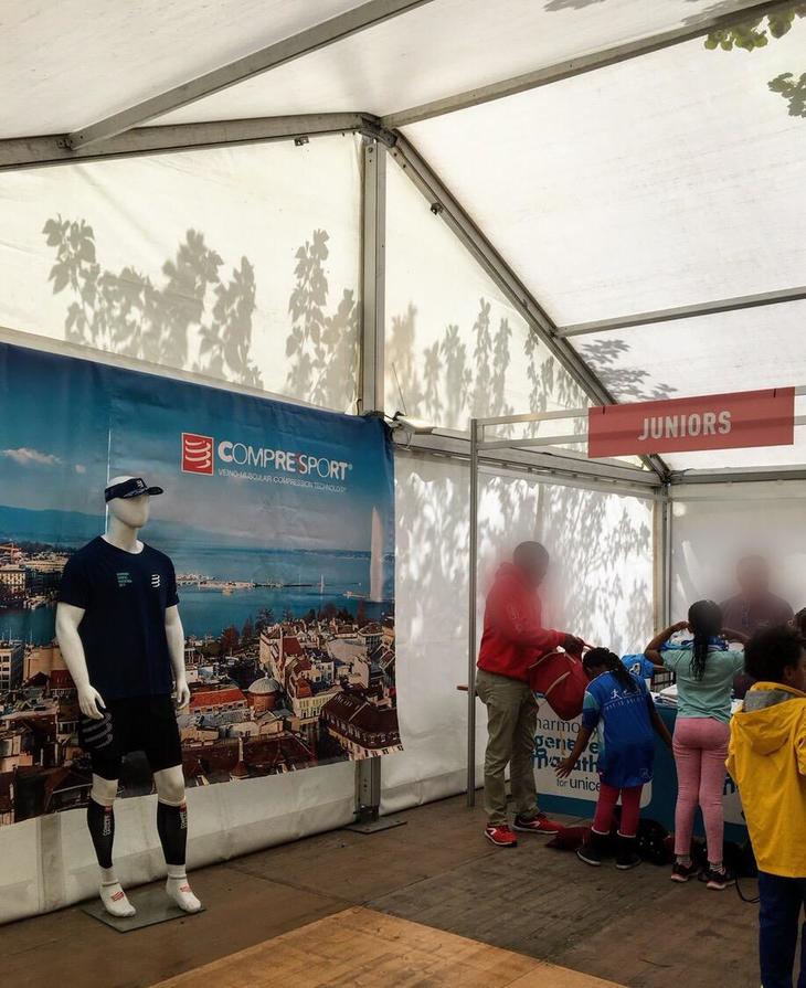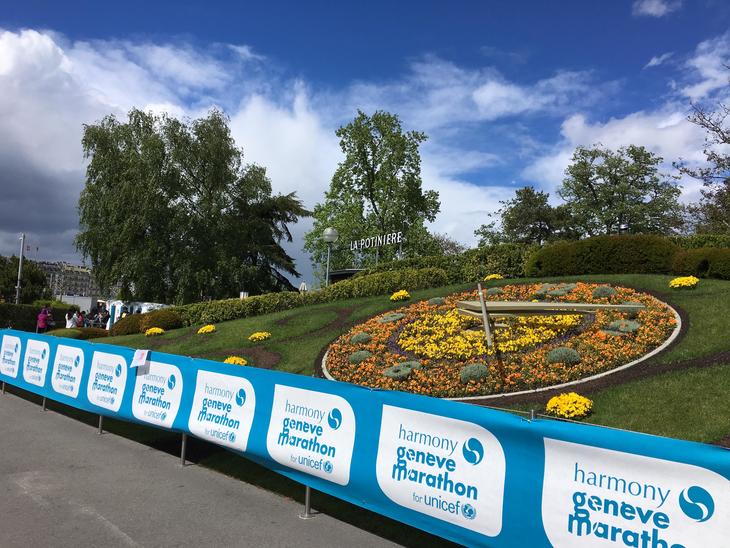 今回参加したのは12日に開催されたスイス、ジュネーヴ マラソン。スイスとフランスにまたがる美しいレマン湖を望みながら走るコースで、ゼッケンを配る会場は湖前のアングレ(イギリス!)庭園でした。会場に繋がる橋には大きな国旗とジュネーヴ州旗がこれでもかとはためき、来場者の気分を盛り上げます。