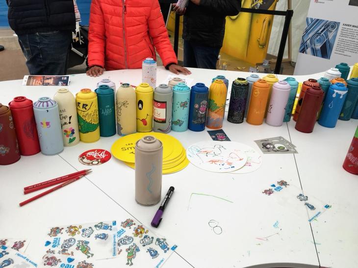 エコをテーマにした別の特設会場に足を踏み入れると、子供も参加できるアクティビティが多く用意されていました。中でも使用済みスプレー缶にペイントやシールを施した工作コーナーは、そのアイディアとデザイン性に驚きました。