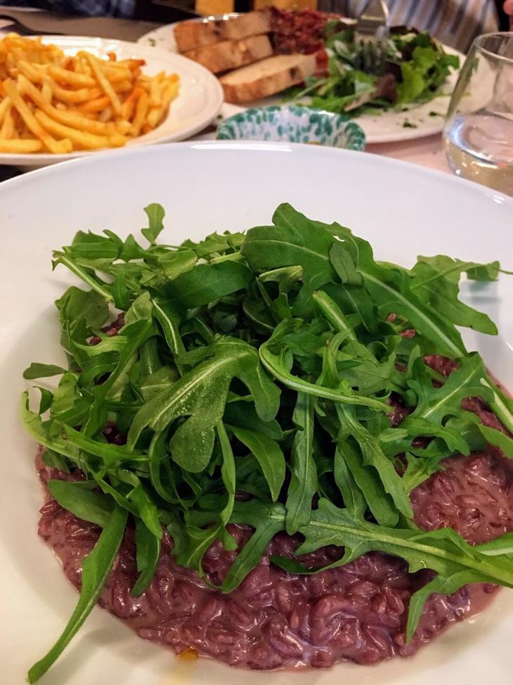赤ワイン煮のリゾット28フラン(約3050円)は、日本の優に3倍はありそうな量で、それで値段も3倍なんでしょうか。酸味が強く、かつ具が一切ないので少々飽きがきてしまうのは致し方ありません。