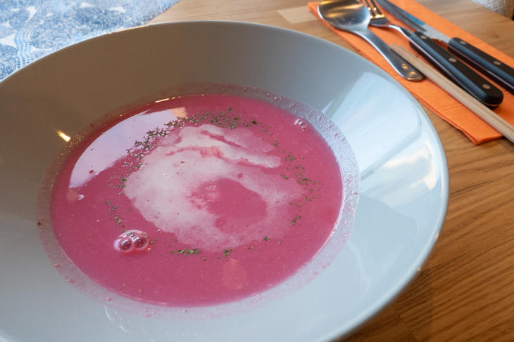 リースサラダに代わりスープを選ぶ場合は、例えばこの日は「ビーツのスープ」。