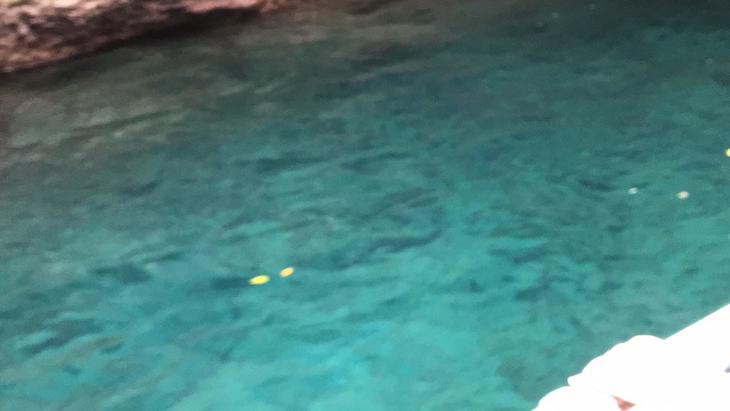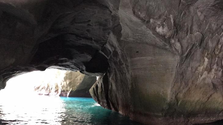 洞くつ中央、天井が丸く抜け落ちた「天窓洞」から差し込む太陽光を受けて、とても綺麗な色になるわけです!
