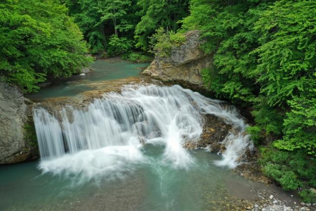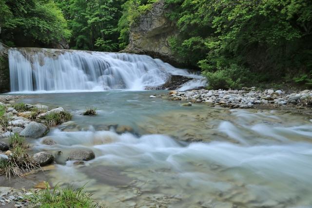 木賊温泉傍を流れる西根川にかかる滝で、幅約20m、落差は約10m。