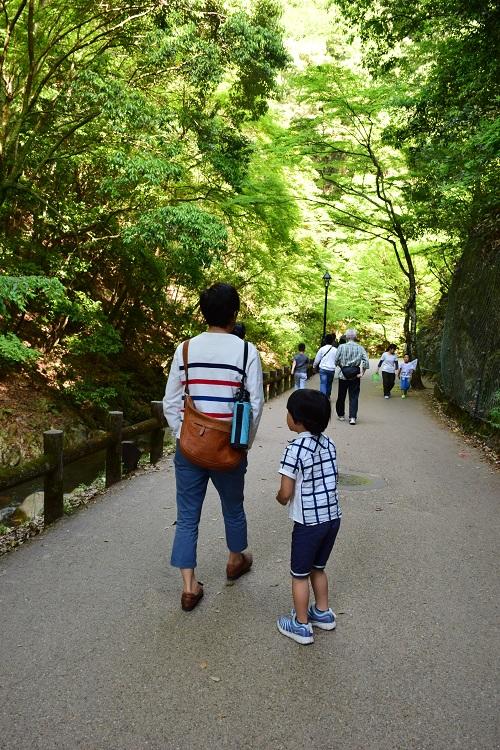 箕面公園と昆虫館には専用の駐車場がありません。筆者は、阪急箕面駅周辺の有料駐車場に車を停め、片道15分歩いて昆虫館に行きました。そして、また15分かけて箕面駅まで戻って車に乗り、滝の少し先にある大日駐車場に車を停めて滝まで歩いて行きました。筆者が行った昨年は台風被害で通行止めになっていた(現在は復旧しています)ので歩きませんでしたが、45分歩いて滝まで行き、また戻って来るのは小さなお子様には難しいかと思います。また、大日駐車場は70台しか停めることができませんので紅葉の季節は満車ですし、滝を見るのが30分程度にも関わらず駐車料金が土・日や紅葉期間は1回1000円(平日は無料開放)です。大日駐車場から滝までは徒歩10分程度です。川沿いの遊歩道は木の陰になっていますので、比較的涼しいかと思います。ところどころにお店もありますので、休憩することもできます。体力と相談の上、新緑ハイキングを楽しんでくださいね。