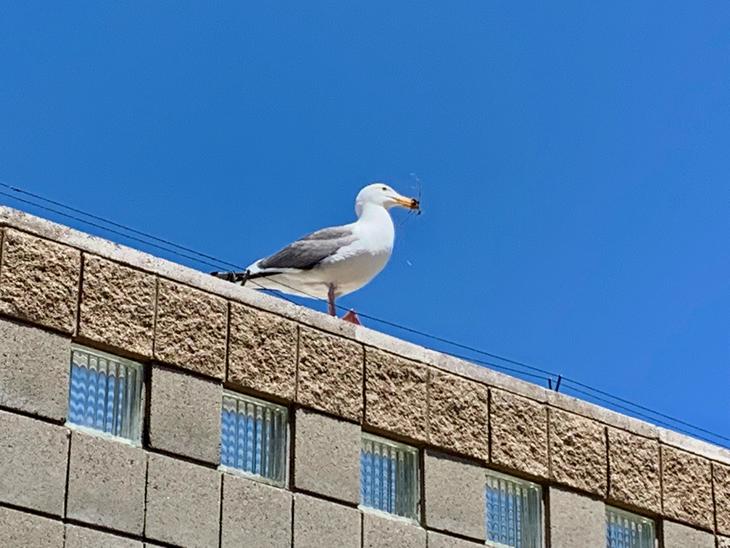 クチバシには小枝をくわえている(多分)トーちゃんカモメ、ここん家はこれから巣作りにはいるようだ。