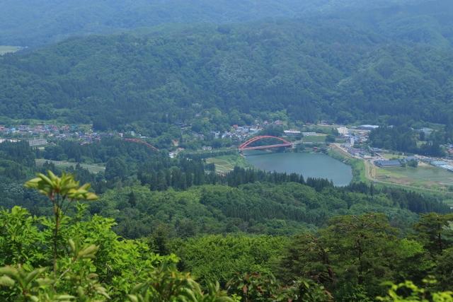 途中にある展望スポットより、柳津町の中心部とその先に会津盆地を望みます。
