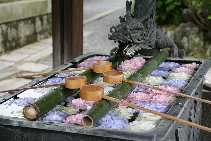 見どころのひとつは、手水舎に活けられた「あじさいの花手水(はなちょうず)」。