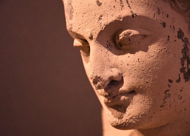 ガンダーラの仏陀坐像。ギリシャ彫刻にも似た彫りの深い顔立ちですね。仏像はギリシャ文明の影響を受けて、ガンダーラで誕生したといいます。平山コレクションは、優しいお顔をされている像が多いと美術館の方がおっしゃっていましたが、ほんとうに優しい表情をしていますね。
