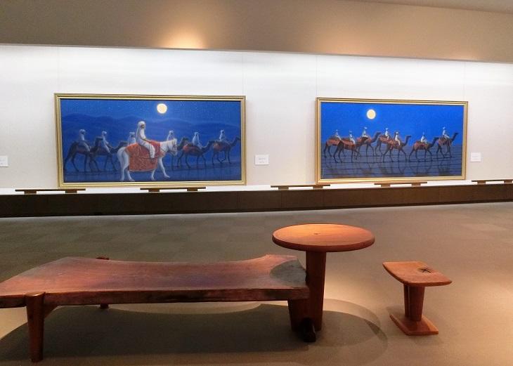 真ん中の古代ローマ遺跡「エフェソス・トルコ」を中心に、砂漠を行くキャラバンの昼と夜の絵が左右対称に展示されています。国境や民族を超えた人々の交流の象徴として、シルクロードを旅するキャラバンを描いていたそうです。