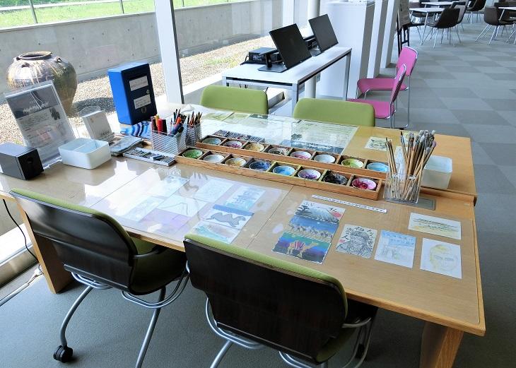 「絵手紙コンテスト」も開催中です。今年2019年のテーマは①「群青」②「花鳥風月」③「シルクロードのいきもの」④「美術館で発見したこと」です。県内の和紙の里身延町で作られた和紙のハガキが用意してあります。
