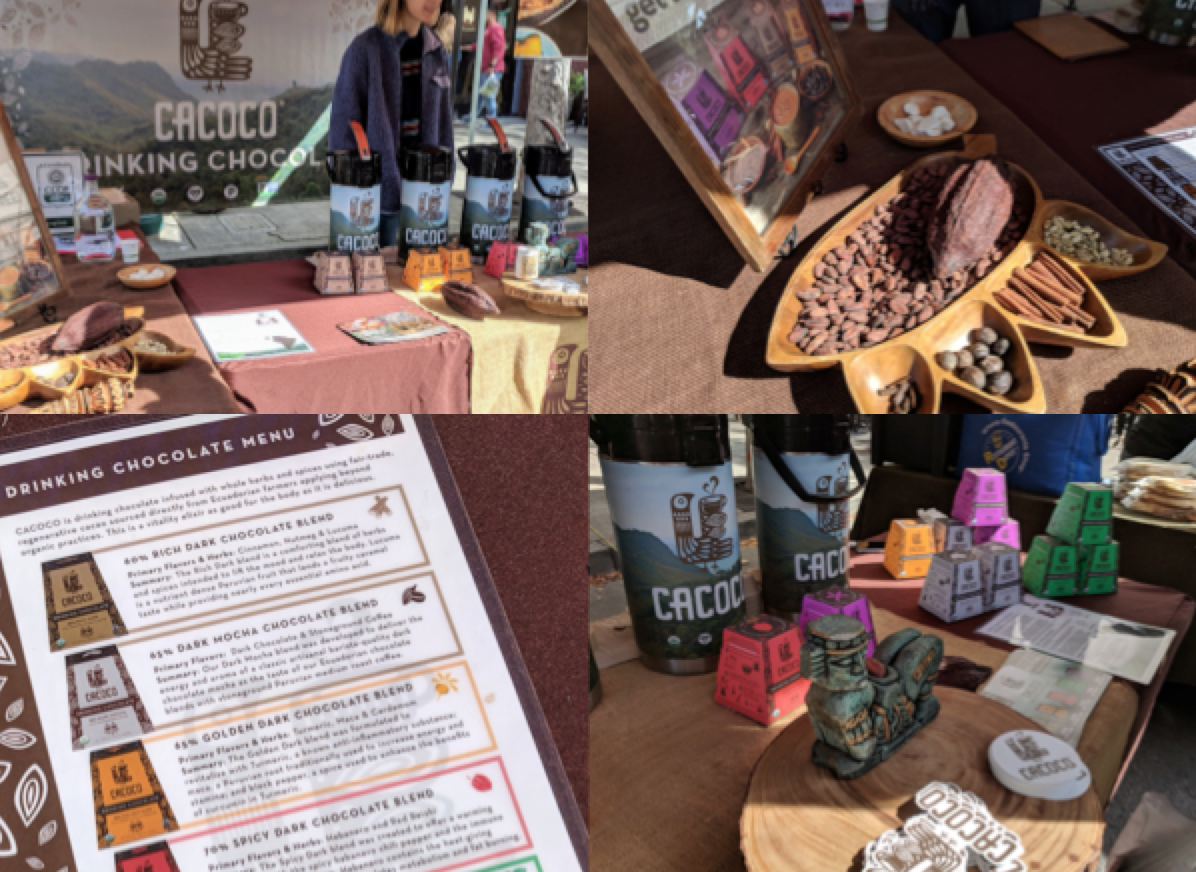 ファーマーズマーケットでのお楽しみの一つは、まだ実店舗を持っていない新規ビジネスの出店との出会いもあることです。今回は、こちらのホットチョコレートのお店を楽しみました。スパイスや一捻りされたホットチョコレート(かなり濃厚!)の数々は試飲もさせてくれ、気に入った味があれば買うも良し、なければ「Thank you!」と感謝を伝えて立ち去ります。