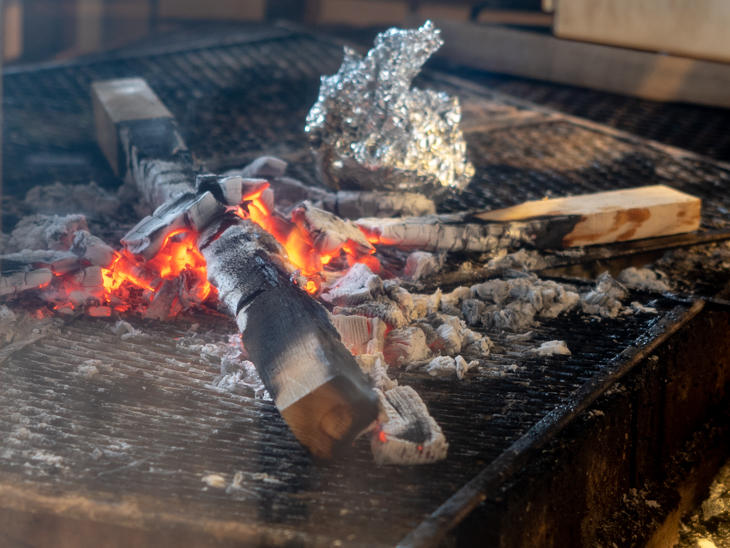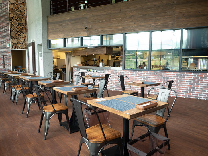 室内ですが、薪式グリルを使った焚火料理もいただけるレストランです。
