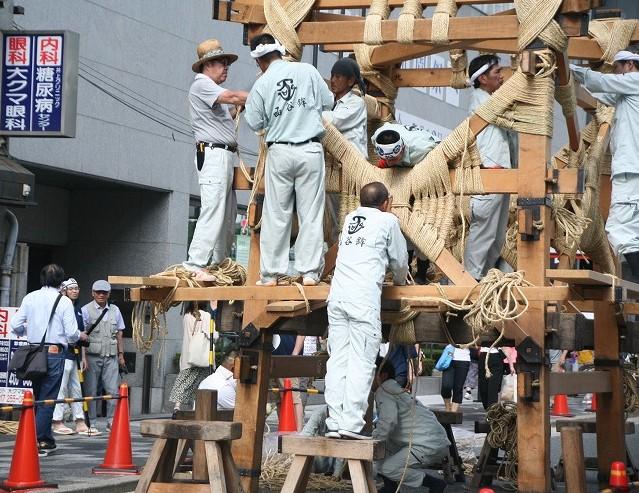 鉾の組み立ては、くぎを一本も使わず、木材を縄で縛って固定する