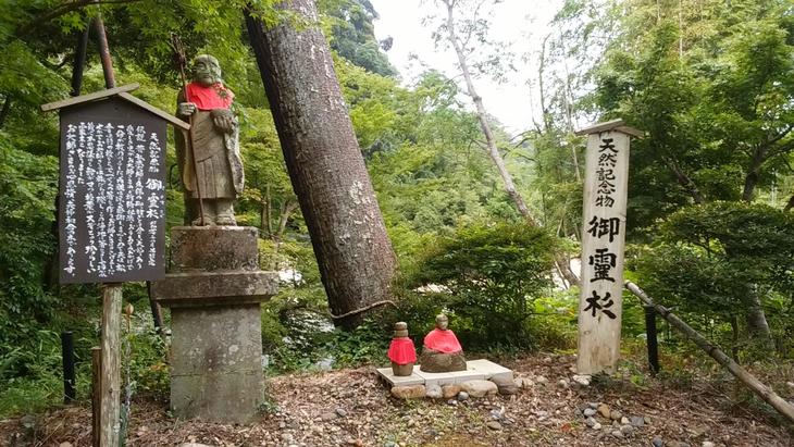 ●山門手前の東側には御霊杉があります。この御霊杉は、弘法大師(空海)とゆかりのある霊木で、弘法大師が油山に滞在した際、病に苦しんでいた貧しい村民の子供を助けたところ、両親がお礼にと、夫が松の木、妻が杉の木で作った一膳の箸をお大師様に捧げたそうです。弘法大師が油山を旅立つ際、その箸を地に挿したところ、不思議と箸から芽が出て、幹が松の木、枝葉が杉の木という珍しい霊木になったと伝えられています。