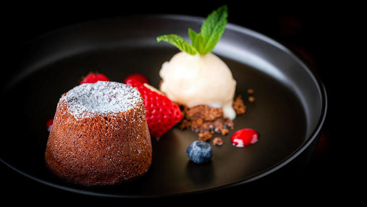 「Lobster Tagliolini」(298ドル)は、ロブスターの上にロブスターのクリームソースがかかったパスタです。パスタの種類はタリオリーニ=長い麺のパスタです。ですので、クリームソースが麺によく絡まっています。「Roasted Whole French Chicken」(238ドル)は、24時間鶏肉を乾燥させてから調理したローストチキンです。香ばしさが口の中に広がると同時に肉の素材の味を活かした料理というのがすぐわかります。デザートでは「Rose Chocolate Lava Cake」(88ドル)がお店のおすすめ。割るとチョコレートが流れ出てくるケーキ、イチゴなどの多彩なベリー系のフルーツのほか、ライムとライチーのシャーベットが皿にのせられています。