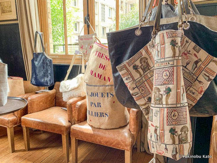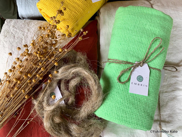 食事の後は、レストラン内で地域で活躍するクリエイターさんたちと顔合わせ。ニューヨークっぽさとル・アーヴルをミックスさせた「LH」やルーアンの「Jeanne a dit」といった服飾ブランド、麻のバッグがかわいいメード・イン・フランスの「Grenouiile Rouge」、ノルマンディー産の麻を100%使って織られたリネン製品の「Embrin」の各担当者さんが、商品を説明してくれました。