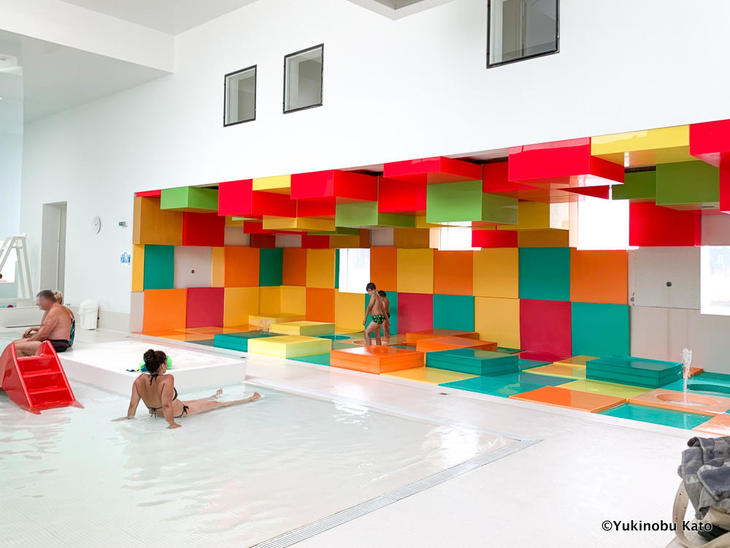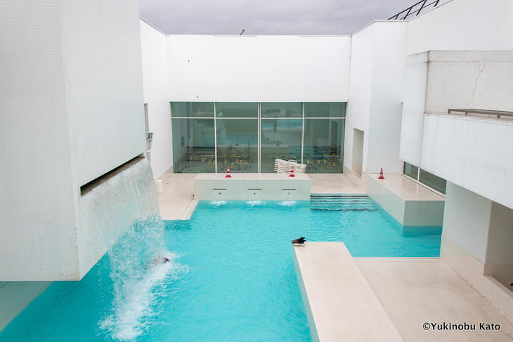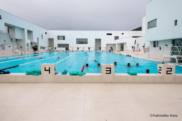 まず最初に着いたのが公共プール「レ・バン・デ・ドック」です。デザインはフランスの建築家ジャン・ヌーヴェルによるもの。公共のプールというと、どうもお役所の無機質なものをイメージしてしまいますが、同所は至る所にジャン・ヌーヴェルのセンスが散りばめられています。
