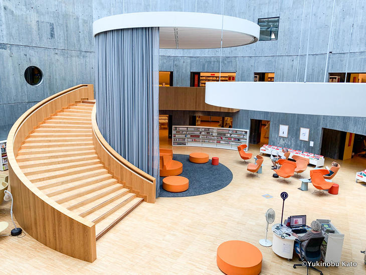 同所は「ル・ヴォルカン」と呼ばれる劇場と、オスカー・ニーマイヤー図書館が入る2棟の構造物からなっており、地上より一段低くした部分で繋がっています。オスカー・ニーマイヤー図書館の間取りの美しさは群を抜いており、内部も部屋や本棚が円を描くように配置。こちらも公共の施設で、市民が普通に使える建物です。