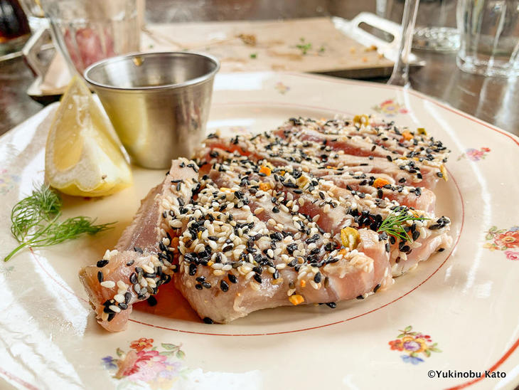 ここでのお酒は、参加者の満場一致で夏らしくワインのロゼを。前菜としてタパスを皆でシェアして、私は主菜にマグロのたたきを注文しました。デザートは畜産業が盛んなノルマンディーらしく、フロマージュ・ブランを選んでみました。