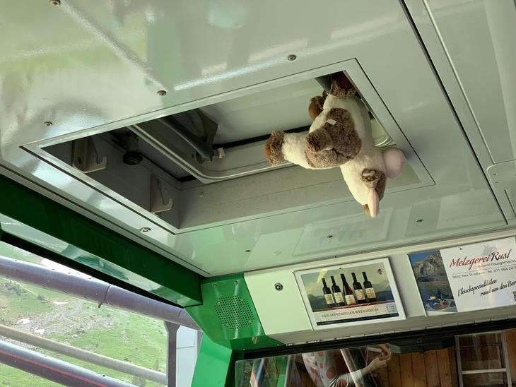 ケーブルカーの中では、なぜか吊るされた牛がお出迎え。