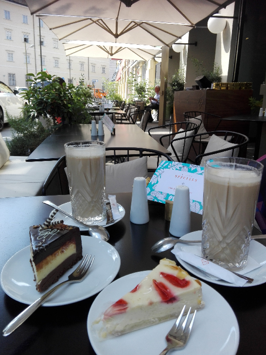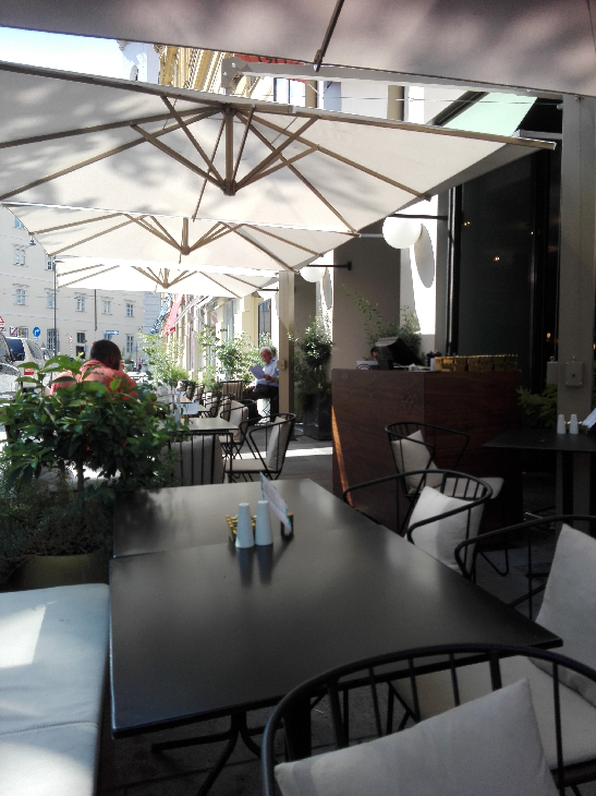ウィーンの多くの飲食店のテラス席がそうであるように、このブラッセリーも、テラス席が出ているのは夏場の限定。なので、もちろん店内も素敵なデザインで落ち着けるのですが、テラスがあるうちは外でゆっくりとお茶の時間(もちろんお食事でも大丈夫ですよ!)をお楽しみになることをお勧めします。