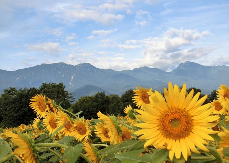 晴れると、ひまわり越しに南アルプス連峰が望めます。今年はまだなかなか顔を見せてくれなくて、去年の写真なんですが、今年は梅雨が長かった分、美しい姿を見せてくれるんじゃないかと期待しています。