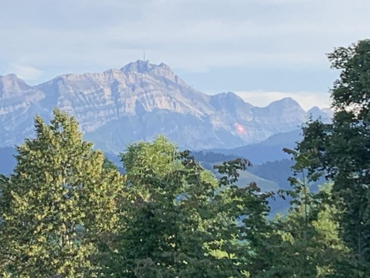 庭から見える、アッペンツェル地方で一番高い山、ゼンティス(Säntis, 2500m)も、この日はスイス国旗が掲げられます!