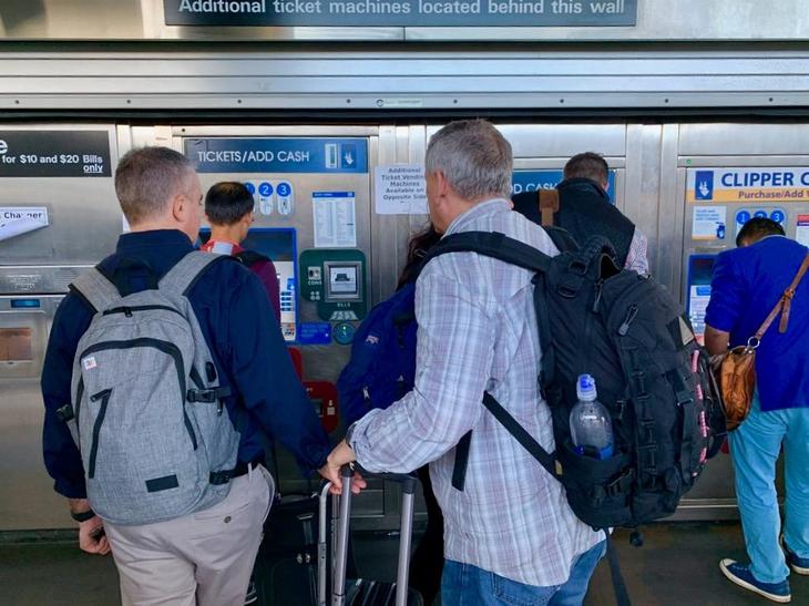 サンフランシスコ空港バート駅の切符販売機前に毎日こんな光景がある。