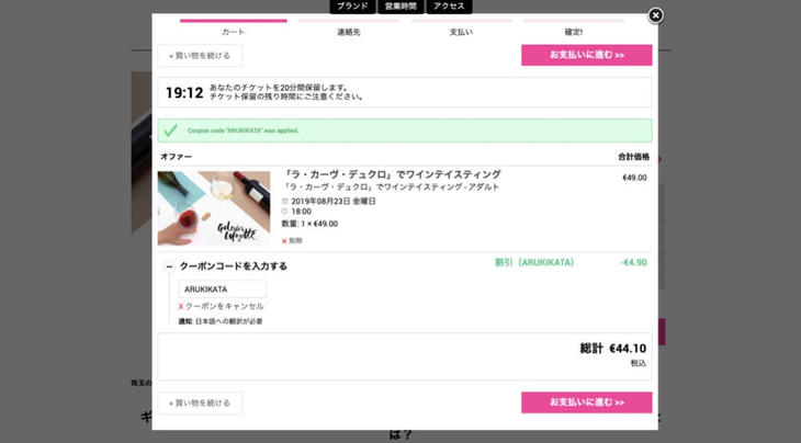 公式サイトからの申し込み時に「ARUKIKATA」と入力すると料金が1割引になります。また、読者向けの割引コードは、ギャラリー・ラファイエット・パリ・オスマン店の他の講座(マカロン教室、ファッションショー、ノルマンディー料理教室)でも使えます(過去記事「日本語でお菓子作りを学べる!ギャラリー・ラファイエット「マカロン教室」に参加してみた【読者割引あり】」も参照)。