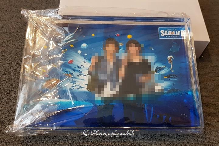水族館では、入館してすぐに写真を撮ってもらえるコーナーがあり、後で、その写真を購入することが可能です。撮ってもらったからといって買わなくても大丈夫です。紙や青い液体の入った透明のケースから選ぶことができました。購入すると、データを指定のページからダウンロードすることもできました。お土産店やレストランも併設されているので、記念に立ち寄ってみるのも良いかもしれませんね。