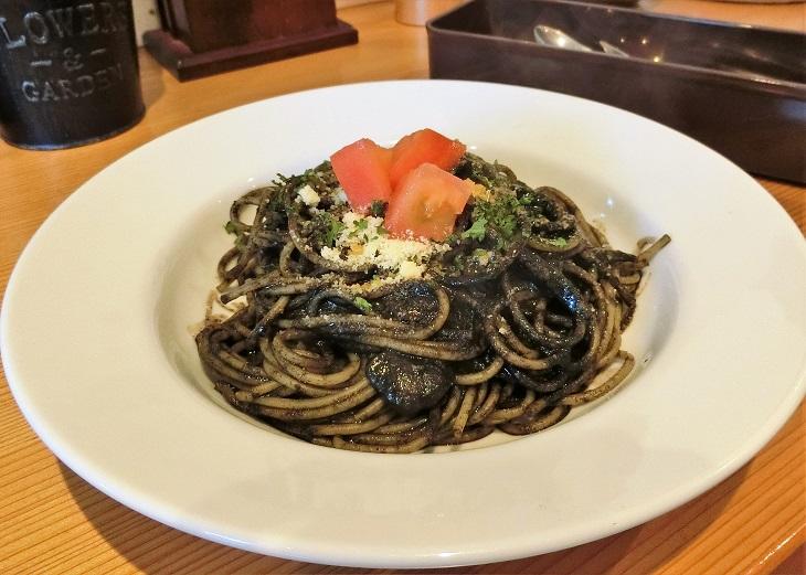 やまめの魚醤入りイカ墨パスタ(税込み1,080円)。海じゃないけどシーフードのいい香り~♩イカ墨大好き♡