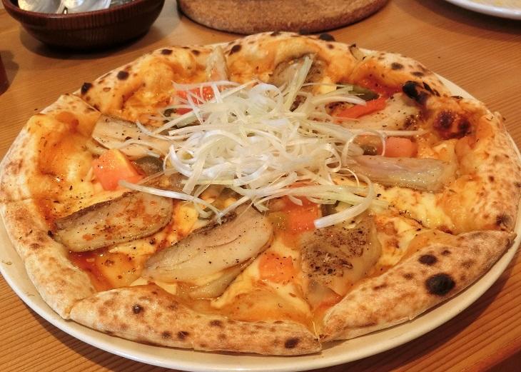 チキンの辛味ピザ(税込み1,350円)。焼きたてもちもち! 本格的な美味しさの秘密は、石窯で焼いているからなんです。