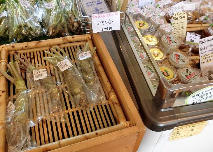 ワサビも有名です。小菅村は多摩川の源流にあたるところなんです。水が澄んでいるからワサビ田にきりりと辛く味わい深いワサビができるんですね。わさび漬けもある~♩