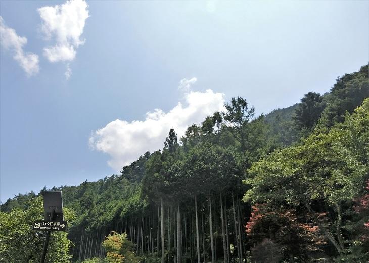 小菅村は、95パーセントが森林。人口約740人の小さな村です。道の駅の前にも、森林が広がっています。