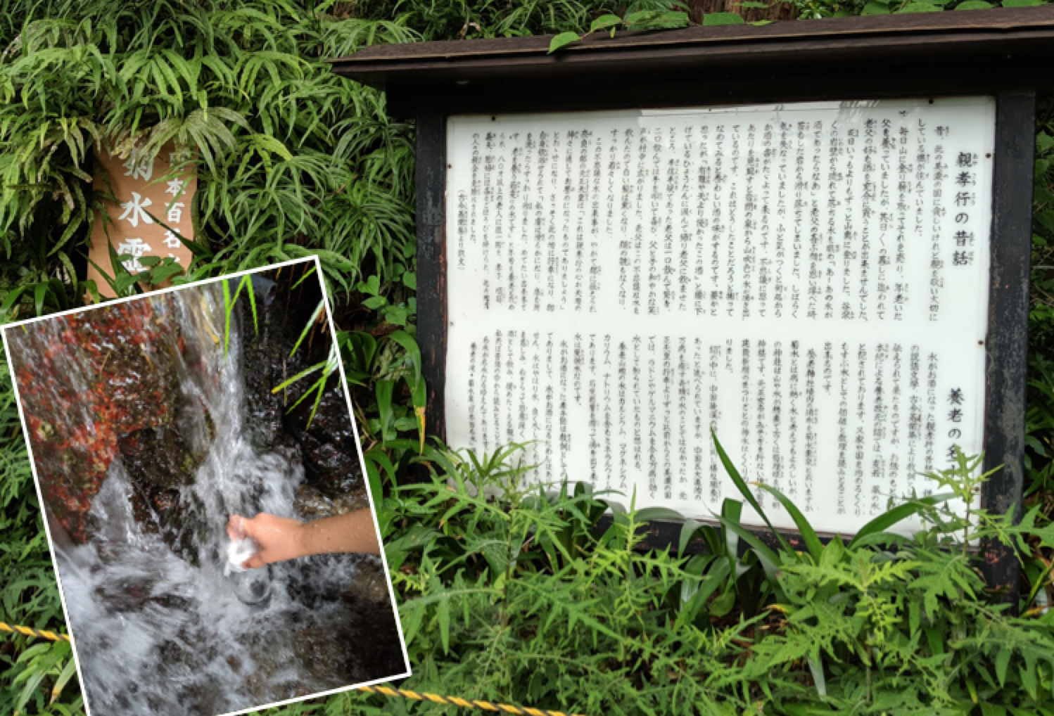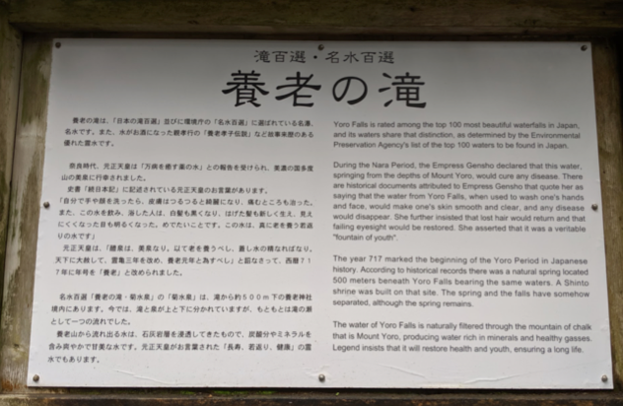 説話集や御伽草子などにもこの伝説は散見している模様ですが、この地にまつわる最古のお話は、延暦16年(797年)に完成した『続日本紀』まで遡ることができるそうです。また、養老という名称は、霊亀3年(717)、元正女帝が奈良の都から行幸になられ、その山地から湧き出る菊水泉の水を飲浴され、「老いを養う霊泉」と元号を養老と改められたことにちなんでいるそうです。