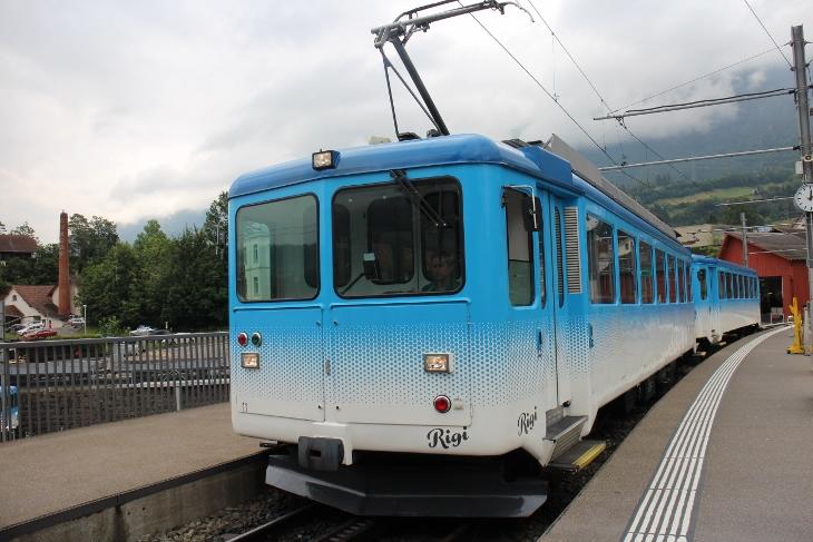 青い登山鉄道に乗り、山頂駅までは約35分。スイストラベルパスも有効です。