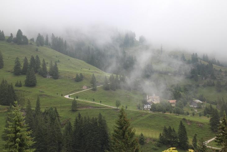 スイスらしい景色を眺めながら登っていきましたが、すでに怪しい空模様・・・