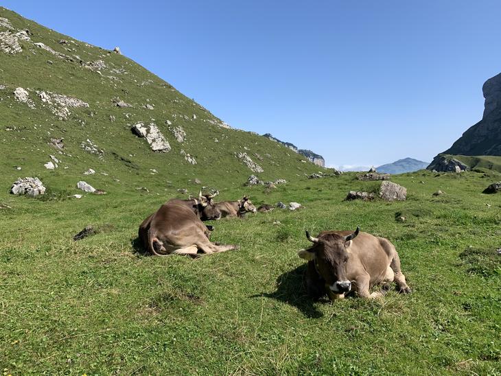 メグリスアルプの山小屋の周辺には、小さな古い教会があったり、ヤギがそこらで寝転んでいたり、放牧されている牛が観光客の手を舐めにきたりと、休憩を楽しむにはもってこいの場所です。