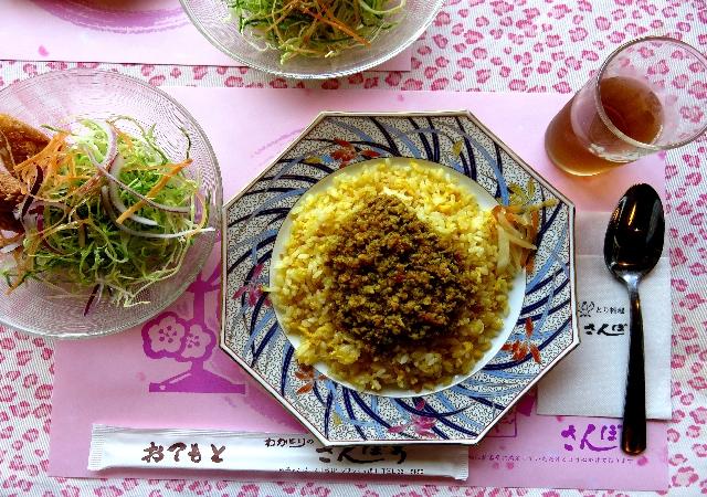 たまごと炒めたご飯の上に鶏肉たぁっぷりの"さんぽう風ドライカレー"