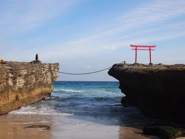 青い海・白い砂浜に鳥居の赤が映える、ベスト撮影スポット♪